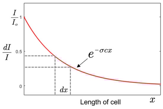 According to Equation (5), a sensor with a high concentration resolution at a shorter length can be realized by using gas with a high absorption cross-section or/and by employing UV source with a high spectral power density (Io) close to the maximum absorption power of an analyte. The differential variation of intensity with the length of the gas cell is shown in Figure 2.