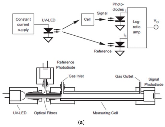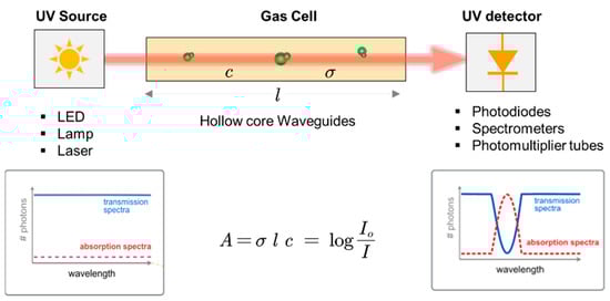 A typical UV-spectrophotometer is mainly composed of a UV emission source, gas cell, and UV photodetector, as summarized in Figure 3, with its working principle. Each component of the spectrophotometer is discussed in the following sections.