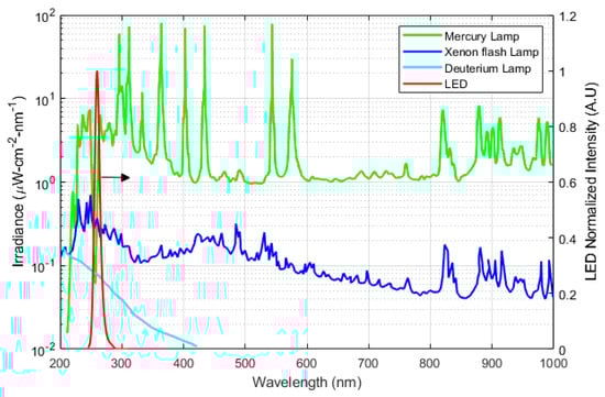 The output intensity of different UV sources. LED (80 µW, Mightex System US) data were obtained from Khan et al. [] and other data were sourced from Hamamatsu Photonics. Mercury Xenon lamp (L2423, 200 W), Xenon flash lamp (L11957, 20 W), Deuterium Lamp (L9519, 30 W) [].