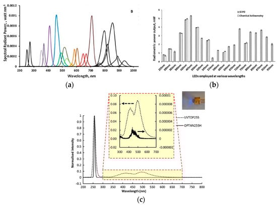 (a) The emission spectrum of different LEDs with different peaks []. (b)The power output of various LEDs at different wavelength []. (c) Output UV spectrum with parasitic emissions for aluminum nitride (AlN)-based LEDs (dashed lines) and sapphire-based LEDs (solid lines) []. Adapted with permission from Elsevier.