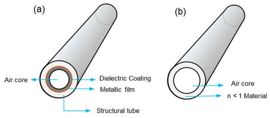 Hollow core waveguides (HCWs) provide an attractive option to be employed as a single-pass gas cell for UV absorption spectrophotometry. HCWs were initially designed as a light-tube for the transmission of high-peak-power laser light for industrial and medical applications [,]. They have been applied for the detection of different analytes in liquid or gas for environmental, process monitoring, and biomedical applications [,]. HCW acts as a light-pipes by transporting radiation inside the co-axial hollow core of the fiber. It can be applied as a miniature gas cell for guiding the radiation for measurement of low gas concentrations. Depending on the guiding mechanism, HCWs can be classified into attenuated total-reflection (ATR) or leaky-mode (LM) waveguides. ATR waveguides are made of tubes with refractive index (n) less than that of the air-core (n = 1) whereas LM waveguides are composed of a tube, with inner wall coated with materials of refractive index greater than one (n>1) as shown in Figure 7 []. In ATRs, the walls are made of alternating dielectric layers, exploiting the photonic bandgap, which gives a frequency-dependent refractive index contrast []. The dielectric layer acts as an optical stop band in the radial direction, and the radiation is propagated only in the axial direction for a selected range of frequencies []. The LM waveguides are composed of structural tubes of silica, metal, sapphire, or plastics with a reflective coating on the interior walls of the hollow core. The radiation is propagated by metallic reflection inside the coaxial hollow core. Some of the common reflective metals for the propagation of radiation, from mid-IR to deep UV are silver, gold, aluminum, and dielectrics. In this type of waveguide, the metallic coating is often covered with dielectric coating for chemical inertness of the coating. The coating is applied using chemical vapor deposition or liquid coating methods [].