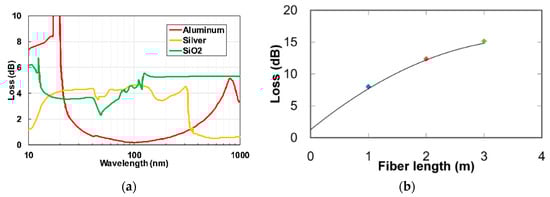 (a) Optical losses for glass HCW with inner walls coated with aluminium (red), silver (yellow) and SiO2 (green) []. (b) Optical losses of glass HCW coated with aluminum for different length of HCW [].