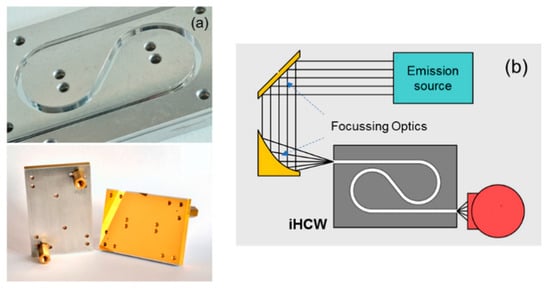 (a) i-HCW developed on the aluminum substrate []. (b) Setup gas detection with substrate-integrated hollow-core waveguides (i-HCW) with IR emission source and detector. Adapted with permission from [], copyright 2019 American Chemical Society.