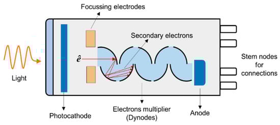 A PMT is a versatile, sensitive, and ultra-fast response device. It has a large detection area and can detect low-intensity levels of light. A typical PMT is made of a photo-emissive cathode (photocathode), focusing electrodes, an electrons multiplier, and electron collector (anode) enclosed in a vacuum chamber, as shown in Figure 13. The photoelectrons generated in the vacuum are accelerated and focused into dynodes. The electrons are then multiplied by the emission of secondary electrons by the successive dynodes until detected by the anode. The major disadvantages of PMT are low quantum efficiency and ageing effects.