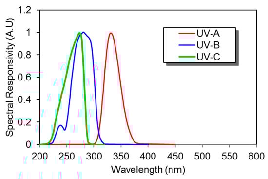 Initially, narrow bandgap semiconductors were used for UV photodetectors, for example, silicon or III-V group compounds (for example gallium phosphide (GaP), gallium arsenide (GaAs)). For such materials, optical and interference filters were installed for spectral-range selectivity and to avoid material degradation []. These devices are sensitive to low-energy radiation and must be cooled for high-sensitive applications to minimize the effects of the dark current [,,,]. These devices also face an issue of ageing effect when exposed to radiation higher than their bandgap []. UV photodetectors based on wide bandgap (silicon carbide (SiC), gallium nitride (GaN), and aluminum gallium nitride (AlGaN)) work at room temperature and offer intrinsic blindness to visible wavelengths. They can operate even at high temperature and high power due to their high strength of chemical bonds and high thermal conductivity. There is no need of external filter to realize the desired UV spectrum even in the presence of high intense visible or infrared light. For example, Si-photodiodes are usually employed with an interference filter to achieve a monochromatic light with a narrow FWHM of 10 nm to minimize the effects of stray light. An example of a Si-photodiode photosensitivity spectrum is shown in Figure 14.