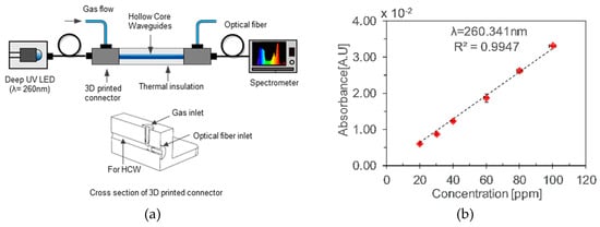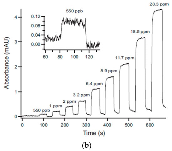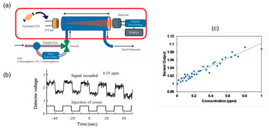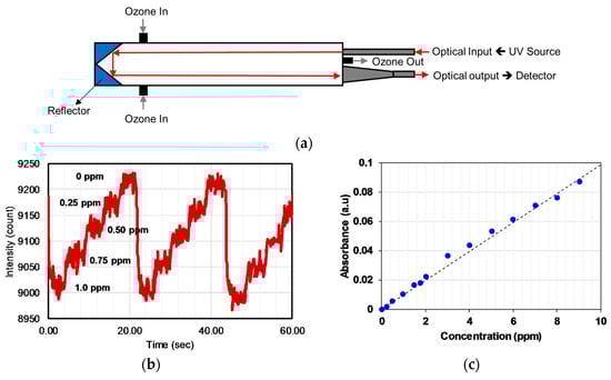 Maria et al. [] developed an ozone monitor using a gas cell of length 400 mm with a retro-reflector to realize a longer optical path (~2 × 400 mm) by the back reflection of a light beam as shown in Figure 16a. A broadband UV source DH2000 (190–2500 nm) and spectrometer with filters were employed as a source and a detector, respectively, to achieve a peak wavelength of 300 nm with FWHM values of 40 nm. The UV source and detector were placed at one side and reflectometer on the opposite side. The linearity of 0.1–10 ppm with a limit of detection (LOD) of 0.1 ppm was achieved, as shown in Figure 16b,c. The LOD was limited by the reflectometer employed.