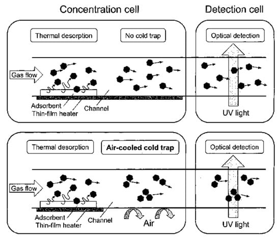 - Ueno, Y.; Horiuchi, T.; Niwa, O. Air-Cooled Cold Trap Channel Integrated in a Microfluidic Device for Monitoring Airborne BTEX with an Improved Detection Limit Air-Cooled Cold Trap Channel Integrated in a Microfluidic Device for Monitoring Airborne BTEX with an Improved Detection Limit. Anal. Chem. 2002, 74, 1712–1717. [Google Scholar] [CrossRef]