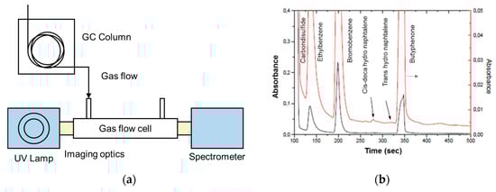 Optical gas sensors based on absorption have been shown to provide a sensitive and selective approach with minimal drift, rapid time response, and a low cross-response to other gases [,]. The measurement is self-referenced and reliable as the transduction is based on direct measurement of a molecule’s physical property (i.e., absorbance at a specific wavelength). Real-time data are obtained without changing the nature of the gases, which can be critical for process control []. There are several gas molecules that absorb strongly in ultraviolet (UV) (wavelength range, 180 nm to 400 nm) and deep-UV (wavelength range, 180 nm to 280 nm), thus by exploiting the absorption property of these compounds, a sensitive and selective sensing platform can be developed. The latest advancements in semiconductor and optoelectronics, for instance, LED and photodetectors and optofluidics have given an opportunity to develop miniaturized UV spectrophotometers for gas sensing applications. For example, molecules of atmospheric interest such as ozone, NO2, SO2, H2S, benzene, toluene, ethylbenzene, and xylene (-p, -m, -o) exhibit strong absorption bands in the deep UV region (λ < 300 nm) as shown in Figure 1.