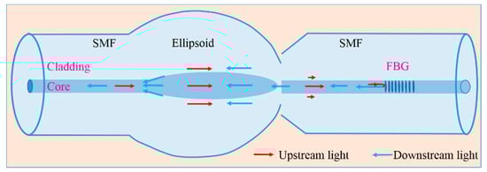 It is well known that standalone FBG can only reflect the core mode, which satisfies the Bragg resonant condition. The total internal reflection determines that the core mode can well be confined in the fiber core, which makes the FBG insensitive to the SRI variation. In contrast, the cladding modes are reflected at the interface between the fiber cladding and the outer medium. Therefore, evanescent waves exist on the surface of the fiber cladding. In this case, the cladding modes can interact with the surrounding medium, and effective indices of the cladding modes can be influenced by the SRI. The basic idea of the proposed structure is to excite cladding modes and recouple the cladding modes into the fiber core in order to have the interference between cladding modes. By monitoring cladding resonant peaks, we can measure SRI. Figure 1 shows the sensing scheme with the proposed structure. The red arrows represent the upstream light, i.e., the input light, and the blue arrows represent the downstream light, i.e., the reflected light. When the input light is injected from the single-mode fiber (SMF) to the ellipsoid, the cladding modes will be excited, and the core mode will be reflected by the FBG. The reflected light will be propagated through the ellipsoid once more, and the cladding modes will be excited and recoupled back to the SMF. The ellipsoid acts as a mode exciter. If without an ellipsoid, a considerable part of the reflected cladding modes will be leaked out after propagating a certain distance.
