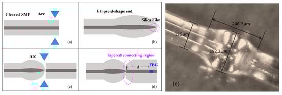 According to the fabrication sequence of the ellipsoid and the grating, there are two fabrication schemes of the proposed sensor: (1) an inscription of fiber grating and then fusing with the ellipsoid, and (2) fusing the ellipsoid and then an inscription of fiber grating. The sensor fabricated with the former scheme is easily broken with the valued FBG. Especially, the distance between the ellipsoid and FBG is hard to be controlled precisely. Therefore, the latter scheme is adopted to fabricate the sensor used in this work. The fabrication process is shown in Figure 2a–d. Firstly, a cleaved single mode fiber (Corning, SMF28) was put into the fusion splicer (Fujikura, FSM-100P). The discharge time and intensity were 1300 ms and 200 bits, respectively. After discharging, the fiber tip formed an ellipsoid. The electric arc, which was applied on the surface of the fiber, resulted in the unequable temperature field between the core and the cladding, and thus a silica film at the end of the ellipsoid was formed. Then, the ellipsoid was spliced with an SMF. It is noted that the asymmetrical shape of the ellipsoid and the SMF led to a tapered region. Later on, the sample will be put into the hydrogen loading chamber. After 14 days of hydrogen loading at 10 MPa, the FBG was precisely inscribed in the SMF cascaded with the ellipsoid, as indicated in Figure 2d. The FBG was inscribed using a 248-nm KrF excimer laser (150 Hz, 12 mJ) with a 0.15 mm/s scanning speed. The FBG has a period of 535 nm and a length of 10 mm. Especially, the distance (d) between the ellipsoid and the FBG is precisely controlled from 2 mm to 18 mm for different samples. Figure 2e shows the typical image of the ellipsoid in the proposed sensor, where the length and diameter of the ellipsoid are 246.3 μm and 192.2 μm, respectively.