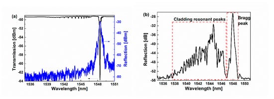Optical fiber-based sensors have attracted much attention due to their unique advantages [,,,,], such as compact size, immunity to electromagnetic interference, and fast response time, which are based on a variety of principles and structures, such as fiber gratings, fiber lasers, fiberoptic interferometers, etc. Therefore, they have widely been used to monitor the temperature [], the curvature [], the gas [], etc. []. In recent years, several types of fiber refractive index sensors have also been demonstrated by monitoring the effective index changes of the guided modes, which are caused by the perturbation of the SRI [,,,,]. A microfiber-based refractive index sensor can realize the SRI sensing with ultrahigh sensitivity; however, it suffers from extreme mechanical instability [,,]. Mach–Zehnder structure-based refractive index sensors can stably be applied in practical measurements, but the sensing system is complicated []. The fiber grating-based refractive index sensor has many advantages, including that it has strong mechanical stability, is easy to embed, and allows the simultaneous measurement of multiple parameters [,,,,]. In fact, for the most classic fiber grating, the fiber Bragg grating (FBG), is naturally insensitive to the SRI variation, since the reflected guided mode is mainly confined in the fiber core []. Compared with the confined core mode, cladding modes can strongly interact with the surrounding medium, which offers great potential for the SRI sensing. Thus, long-period fiber grating (LPFG) is proposed for the SRI sensing, because it implements light coupling between the core mode and cladding modes to provide resonant peaks in the transmission spectrum, which are easily influenced by the SRI changes [,]. However, the LPFG-based refractive index sensors are not compact because they can only be operated in transmission mode []. The combination of FBG and LPFG has further been investigated for SRI sensing [], but it will undoubtedly increase the fabrication complexity requiring two sets of grating writing devices, and this structure is not conducive to system integration. In addition, tilted fiber Bragg grating (TFBG) is another candidate for SRI sensing, but the development is hindered by its fabrication complexity [,].