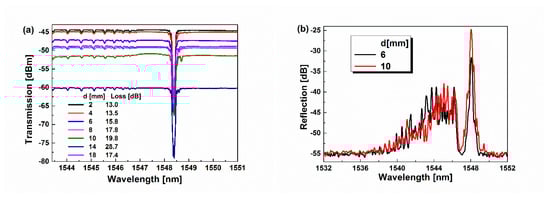 To verify the fabrication repeatability of the proposed sensor and the influence of the insertion loss due to the introduction of the ellipsoid, a series of the FBG cascading the ellipsoid with different d have been fabricated with other uniformed conditions. Their transmission spectra are monitored and shown in Figure 4a. Seen from the transmission spectra in Figure 4a, the ghost resonant peaks due to the ellipsoid almost appear at the same wavelength with similar depth, although the distance (d) and loss varied, as listed in the inset of Figure 4a. The insertion loss introduced by the ellipsoid greatly reduces the baseline of the transmission, but it almost has no influence upon the depth and position of ghost resonant peaks. Such observation demonstrates that the proposed structure has low requirements on the fabrication process, which offers the possibility of the fabrication of more compact sensors. Especially, when the ellipsoid is separated from FBG by 6 mm and 10 mm, the reflection spectra of FBG cascading the ellipsoid are measured and shown in Figure 4b. As seen in Figure 4b, the Bragg resonant peak and the cladding resonance peaks almost exist in similar positions in accordance with the observation of the transmission spectra in Figure 4a, although the reflection intensity of these peaks displays some difference, which is possibly due to the fine difference of the ellipsoid shape.