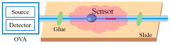 In order to investigate the SRI sensitivity of the proposed sensor, we carried out a series of experiments to detect the reflection spectra in response to the SRI. The schematic diagram of the experimental setup is shown in Figure 5. The OVA was used to measure the reflection spectra with a standard wavelength resolution of 3.2 pm. Two ends of the sensor head were fixed on a glass slide to keep the fiber stationary during the experiment. A small amount of dimethyl sulfoxide/water solutions with different refractive indices ranging from 1.3352 to 1.4426 were dispensed with a pipette onto the sensor. The refractive indices of the solutions were calibrated by using a commercial Abbe refractometer with the accuracy of 0.0002.