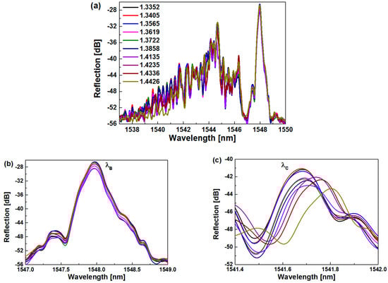 Figure 6a shows the spectral response of the proposed sensor versus the SRI. From Figure 6b,c, it can be seen that as the SRI increases, the Bragg wavelength (λB) remains unchanged, but the wavelength of the cladding resonant peak (λC) experiences a redshift. The unchanged Bragg wavelength is because the core mode propagates in the FBG, which is not influenced by the SRI. When the modal field of the cladding mode overlaps with the surrounding medium, the effective indices of cladding modes are strongly related to the SRI. As the SRI increases, the effective indices of the cladding modes increase, which has an influence on the coupling between the downstream cladding modes and the upstream core mode. Thus, the redshift of λC was observed. After propagating a certain distance, the reflected cladding modes are coupled into the fiber core, and then they will be not influenced by the SRI.