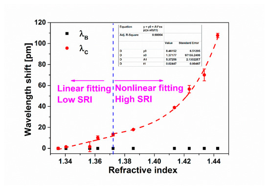 Furthermore, Figure 7 shows the shifts of λB and λC versus the SRI. It can be seen from Figure 7 that as the SRI changes, λB remains unchanged, while λC moves to the longer wavelength. As shown in the dashed line at the left side, when the SRI increases from 1.3352 to 1.3722 (low SRI), the shift of λC has a linear relationship with the SRI, along with a sensitivity of 352.6 pm/RIU. As shown in the dashed line at the right side, when the SRI increases from 1.3722 to 1.4426 (high SRI), the fitting curve follows an essentially exponential function, along with a maximum sensitivity of 4182.2 pm/RIU from 1.4336 to 1.4426. The obtained sensitivity is not higher than some previous reports [,,,,], and the sensitization technique is desired to further improve the SRI sensitivity. The relationship between the wavelength shift ΔλC and SRI can be described as following: