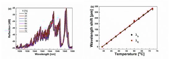 When the proposed sensor is used for SRI sensing, it is inevitable to encounter the temperature fluctuation. So, it is necessary to investigate the temperature response of the proposed sensor to minimize or eliminate the cross influence from the temperature variation in the SRI sensing. Here, we carried out a series of temperature tests by immersing the sensor at the bottom of the water tank (~20 L). For ease of operation, the hot water was poured into the water tank. With the water cooling down naturally (the actual temperature of the water was measured by the thermometer), the reflection spectra of the sensor were monitored in situ with OVA. Figure 8a shows the reflection spectra at different temperatures. As seen in Figure 8a, with the temperature increasing, the reflection spectra redshift, and the reflection intensities increase due to the minor decrement of the refractive index of water. However, the shape of the reflection profiles is almost kept the same. Furthermore, Figure 8b shows the dependences of the shift of λB and λC on the temperature change. It can be seen that both λB and λC linearly shift about 328.0 pm when the temperature changes from 39 °C to 72 °C, along with almost the same temperature sensitivity (KTB = KTC) of ~10.76 pm/°C.