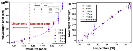 where the transition between the linear and non-linear fittings is set at n = 1.3722. If the fitting transition is set at n = 1.3858, the fitting adjusted R2 for the non-linear region will be reduced from 0.98 to 0.96. In addition, it is noted that more data points for n = 1.38–1.41 will be greatly beneficial for the consolidation of the select of the fitting transition. From Figure 7 and Equation (1), two separate fittings are obtained. The main reason is considered as follows. The evanescent waves rapidly weaken to vanish at the boundary of fiber when the SRI is much lower than the refractive index of the fiber cladding. However, as SRI increases to be larger than 1.4, the restriction effect of the fiber boundary reduces, and the evanescent waves propagate farther, resulting in a higher SRI sensitivity. Especially, when this refractive index of the ambient medium is very close to the refractive index of silica, the cladding modes will not be guided by the fiber well, since the boundary between two media disappears, finally resulting in almost ~10 times higher maximum sensitivity compared with a low SRI range [].