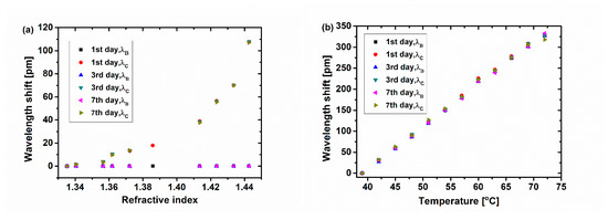 Actually, the shift of λB and λC should have some difference, as the cladding resonant peaks are affected by the change from both temperature and refractive index of water (due to the thermo-optic effect of the water), while the Bragg resonant peak is only affected by the temperature change. According to the reference [], the refractive index of water almost reduces linearly from 1.3199 to 1.3142 with the temperature increasing from 39 to 72 °C. Here, it is assumed that the shift of λC should follow Equation (1) in the linear range (low SRI). In such case, λC shifts due to the variation of the refractive index by the temperature change from 39 to 72 °C being approximately −2.0 pm (given out a temperature response of approximately 0.06 pm/°C), which is about 0.6% of the wavelength shift, as shown in Figure 8b. It is not only lower than the standard wavelength resolution of OVA (3.2 pm), but also much lower than the wavelength shift (328.0 pm) that resulted from the temperature change in Figure 8b. Therefore, the contribution of SRI change from the temperature variation upon ΔλC can almost be neglected, resulting in the same temperature sensitivity of ~10.76 pm/°C for both λB and λC. Such a result also demonstrates that the temperature sensitivity of the sensor is mainly determined by the thermo-optic effect and thermal expansion effect of silica fiber, similar to the normal FBG sensor.