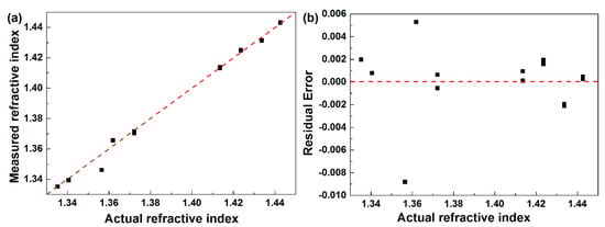 Furthermore, based on the proposed sensor, the measurements of a series of known SRI solutions have been performed. According to Equations (1)–(3), the refractive indices of these known SRI values were measured, where the measured SRI values versus the actual SRI values are plotted in Figure 11a. As seen from Figure 11a, most of the points are close to the red dash line, which further verified the proposed sensor. Especially, the measurement error was plotted in Figure 11b. As seen from Figure 11b, the measured error is ranged from −0.0088 to 0.0053, giving out an averaged measured error of 0.0037. All these results indicate that the proposed structure works well as a temperature self-compensated refractive index sensor.