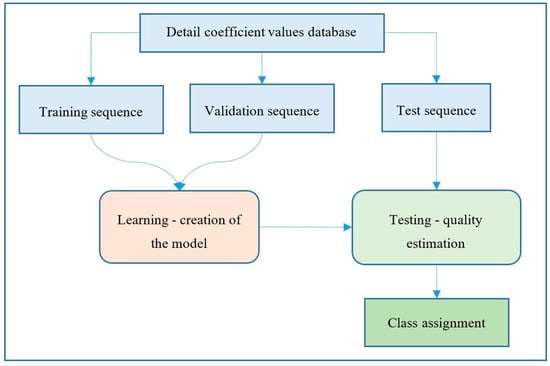 The block diagram of general learning and classification process is presented in Figure 2. First, the input data we gathered (detail coefficient values, calculated for all signals in the database) was divided into three groups: training, validation and test sequences. Next, the classification model was created and then validated using the first two sequences. Finally, the model was tested using the third dataset, while the model quality was estimated. The process of learning and testing was repeated number of times, by adjusting model parameters, until optimal model quality was achieved.