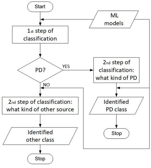 A two-step classification method was proposed in this paper. In the 1st step, it is indicated whether PD is present in the analyzed AE signal. In the 2nd step, it is determined what kind of PD or what other defect was identified based on the AE signal. The flowchart of the method is presented in Figure 3. Such a two-step classification method is currently expected for its potential application in a technical condition assessment system, because the crucial question is whether a PD occurs or not, and this may be answered already in the 1st step of the method.