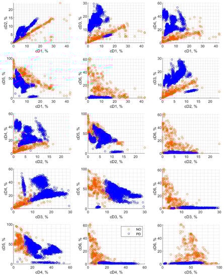 Figure 4 shows scatter plots of detail coefficients pairs, which were calculated using wavelet decomposition and divided into two classes for the 1st step of classification: “NO” (other source) and “PD”, (PD source) respectively. The colors correspond to the class applied for the classification process. The charts depict an exemplary representation of dependencies between the considered features. The points for the two classes in Figure 4 can be in many cases easily distinguished visually since there is practically no overlap between them. However, the division of points into two classes is not always trivial; hence different algorithms of machine learning are proposed in this paper to investigate their applicability to this task.