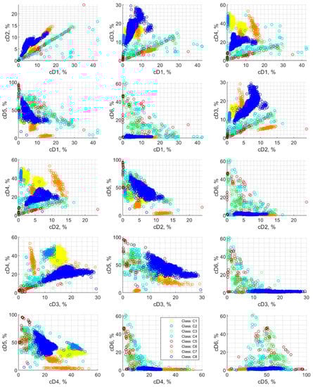 Figure 5 shows scatter plots of detail coefficients pairs, which were calculated using wavelet decomposition and divided into eight classes for the 2nd step of classification. Additionally, in these charts, the colors correspond to the class applied for the classification process. These are exemplary representations of dependencies between the six features considered for classification. In contrast to the two-class case, the points for the eight classes in Figure 5 cannot be easily distinguished visually since there are many which overlap each other. The distribution of features is not always a coherent group, as is the case with class C1 and C8. For example, the dependencies for detail coefficients cD6 on the ordinate axis are strongly mixed and scattered over a wide area. Moreover, in some cases, the features are located in two groups of signals, which are separate in space, as is the case of class C7. This can be seen in many detail’s dependencies; e.g., cD3(cD1), cD4(cD1), cD5(cD4), cD5(cD3), cD4(cD3), cD5(cD1) and cD3(cD2).