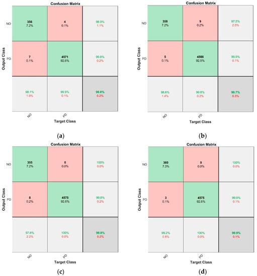 - For the FT model (Figure 6b)—the “NO” class was misclassified as “PD” class in only five of 363 cases, while the “PD” class was misclassified as “NO” class in only nine of 4575 cases,