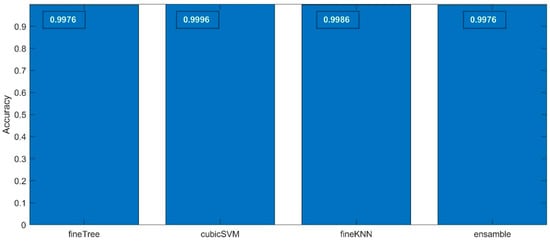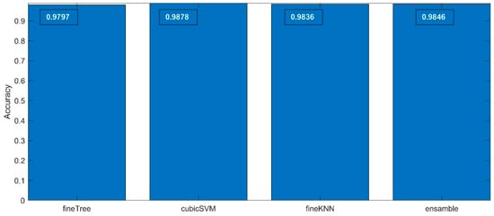 The accuracy values of the results gathered in 2nd step classification process are presented in Figure 9, where the exact values are depicted in the figures upper section in white. In all cases, the accuracy value exceeded 0.97, proving very good classification results. Although the differences are very similar and the values differ in the hundredth part, we can state that also, in this case, the SVM model (cubicSVM) reached the best rating.