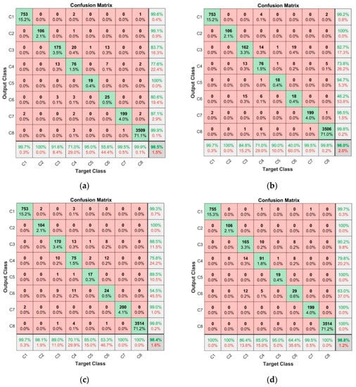 Figure 8 depicts the calculated confusion matrices based on 2nd step classification results for the four classification methods applied: EBT model (Figure 8a); FT model (Figure 8b); KNN model (Figure 8c); SVM model (Figure 8d), respectively. As may be explicitly observed, in all cases the matching (accuracy) values exceeded 98%. In general, all four models had similar results with an error rate not exceeding 2.0%, but, after splitting the classifiers into eight classes, noticeable differences in classification goodness for particular classes were observed. For example, the arithmetic mean value over TPR and PPR µ, exceeded 98.8% for classes: C1, C2, C7 and C8; µ = 93.5% for class C5; and µ = 86.6% for class C3, which indicates optimal classification results. The number of samples is not critical in this process, as it may be seen based on comparison between class C5 (where only 20 samples were available) and class C3 (where, having nine times more data, inferior classification results were achieved). The worst quality metrics were gathered for classes C4 and C6 with µ = 75.1% and µ = 56.8%, respectively.