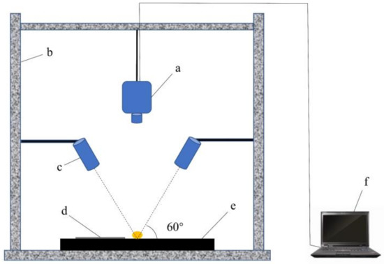 Hyperspectral imaging system. (a) Imaging spectrometer, (b) Darkroom, (c) Light source, (d) Standard gray Spectralon panel, (e) Loading stage, (f) Computer.