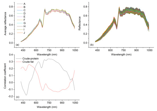 Soybean seed spectral curves and correlation coefficients. (a) Average reflectivity of each soybean variety. A: NanNong 1606; B: ShangDou 161; C: ShangDou 1201; D: ShangDou 1310; E: YuDou 18; F: YuDou 22; G: YuDou 25; H: Zheng 196; I: Zheng 3074; J: Zheng 9525. (b) Reflectivity of all samples. (c) Correlations of spectral reflectivity with crude protein and crude fat.