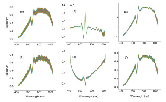 Spectrum curves of all samples preprocessed by Savitzky-Golay smoothing (SG), first derivative (FD), standard normal variate (SNV), fast Fourier transform (FFT), Hilbert transform (HT), and multiplicative scatter correction (MSC). (a) SG, (b) FD, (c) SNV, (d) FFT, (e) HT, and (f) MSC.