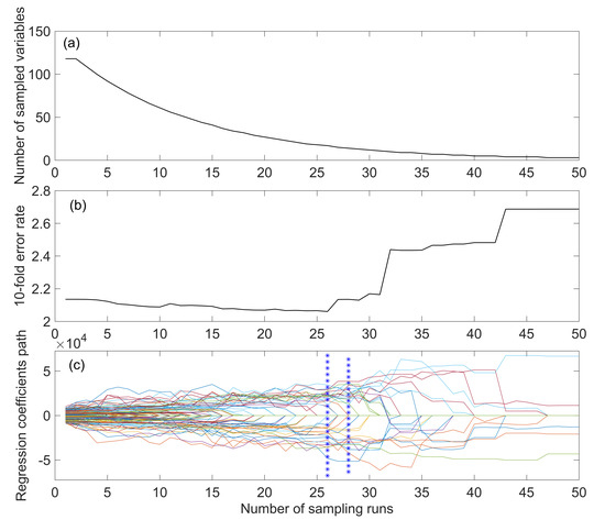 Curves showing the process of characteristic wavelength selection for SG pretreatment by competitive adaptive reweighted sampling (CARS). (a) Number of bands retained with the number of sampling runs. (b) Change curve of root mean square error of cross-validation (RMSECV) with the number of sampling runs. (c) Regression coefficient paths with the number of sampling runs.