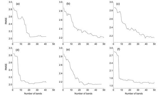 The RMSE is large when the number of selected bands is small (Figure 6); then, as the number of selected bands increases, the RMSE decreases. However, after the number of bands reaches a certain threshold, the RMSE remains almost unchanged. Therefore, the extracted band numbers are 19, 42, 32, 10, 20, and 27.
