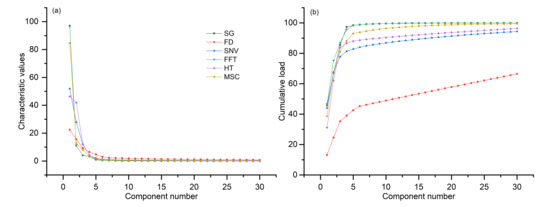 Through PCA, the characteristic values of the first 30 components were determined in this study (Figure 7a). A characteristic value less than 1 indicates that the principal component is not as powerful as the direct use of the original variable. Therefore, principal components with eigenvalues greater than 1 were screened. The numbers of principal component factors extracted from the six pretreatments were 4, 24, 7, 5, 5, and 5, and the cumulative loads were 97.3%, 61.3%, 85.0%, 98.4%, 88.0%, and 93.0%, respectively (Figure 7b). In contrast, SG, SNV, FFT, HT, and MSC extracted very few principal components, but the cumulative loads were very high, as all reached a value of more than 84%. The cumulative load of 24 principal components extracted based on FD pretreatment was only 61.3%, which was the most serious loss compared with the other five pretreatments.