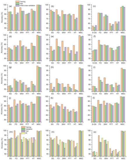 Accuracies of each combination. (a) CARS-Bayes, (b) SPA-Bayes, (c) PCA-Bayes, (d) CARS-SVM, (e) SPA-SVM, (f) PCA-SVM, (g) CARS-KNN, (h) SPA-KNN, (i) PCA-KNN, (j) CARS-EL, (k) SPA-EL, (l) PCA-EL, (m) CARS-ANN, (n) SPA-ANN, (o) PCA-ANN.