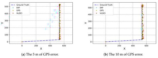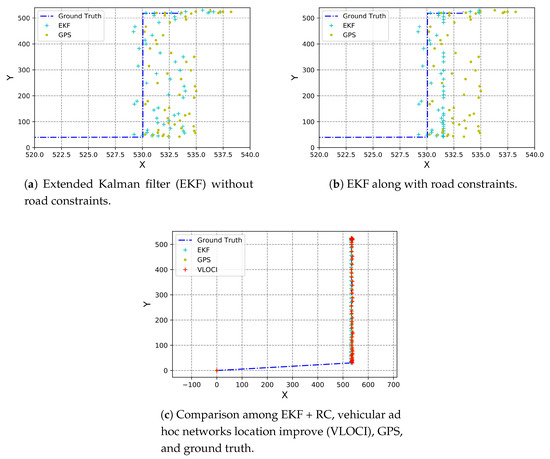 The RMSE values on average of both axes, seen in Figure 15a–c can summarize the behavior of the tested approaches. Overall, we can notice that the best accuracy was reached in the highway scenario that is due to its characteristics: a scenario with no buildings or obstacles, and mostly a straight-line scenario. Moreover, results suggest that the EKF works well using the velocities of the vehicles in this scenario.