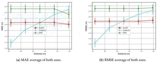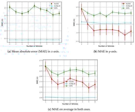 where and are respectively the perfect and estimated vehicles’ coordinates, while the latter varies between GPS, VLOCI, and CoVaLID. In Equation (22), we compute the MAE for one axis to simplify the explanation. However, it is suitable for as many axes as necessary.