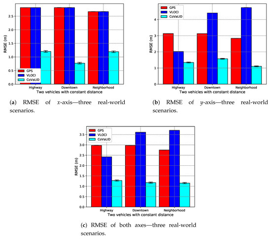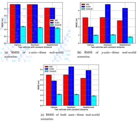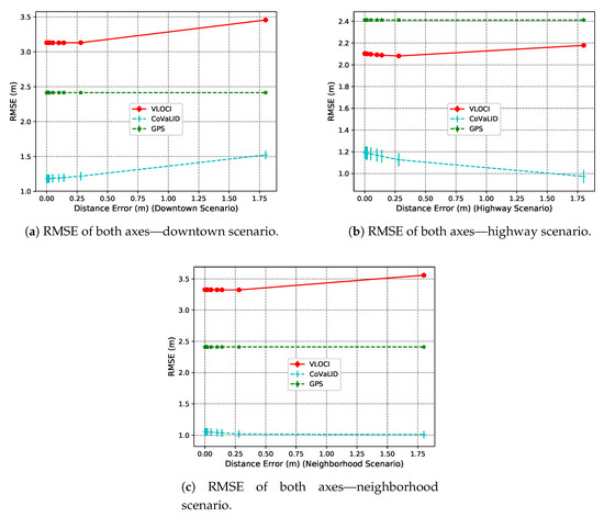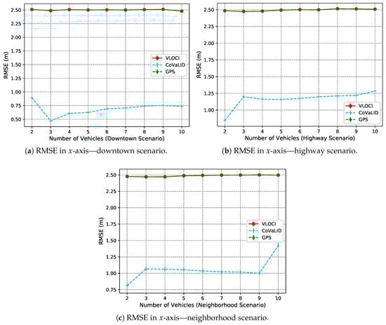 As we can see in Figure 10a–c the VLOCI and GPS had the same value as explained in Section 4.3.1. Furthermore, we can notice that the CoVaLID had its best performance regarding the x-axis in the downtown scenario, while in the highway, it performed with accuracy almost constant, as well in neighborhood scenario, except when increased the number of vehicles for 10. The best accuracy in the downtown scenario can be explained because, in a highway scenario, the vehicle velocity is higher. Hence, the higher the velocity, the more affected is our proposed approach in the x-axis.