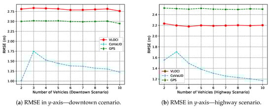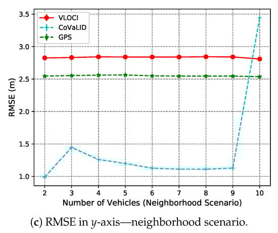 In the y-axis, according to RMSE values described in Figure 11a–c, our proposed method had better performance when compared to both VLOCI and GPS in downtown, highway, and until 9 vehicles in neighborhood scenario. However, when the number of vehicles increased to 10, it can be noticed that CoVaLID had its performance significantly affected. It is explained because, in scenarios with turns, it is more challenging to apply the similarity of triangles concept, since the communication can be affected by obstacles, such as buildings, and houses. Another interesting point is that contrarily to the x-axis, we can notice is that the higher the velocity, the less affected is our proposed approach in the y-axis. Also, in both downtown and neighborhood scenarios, we can notice that VLOCI had the worst performance, it can be explained because VLOCI was developed and tested in straight-line scenarios that is one of the characteristics of highway scenario, where VLOCI can overcome GPS accuracy.