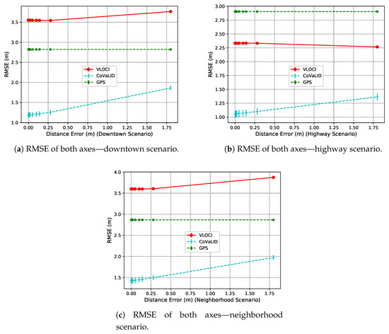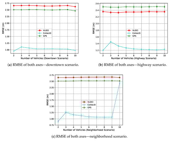 From trajectories with turns, we can observe, according to Figure 17a–c, that CoVaLID presented the same behavior as in the highway scenario, improving its performance. Whereas, in the downtown scenario, its accuracy was affected by the scenarios’ characteristics such as obstacles, lower vehicles’ velocity, and sensors’ field of view. On the other hand, in the neighborhood scenario, the CoVaLID kept RMSE values almost constant. It can be explained due to the combination of lower vehicles’ velocities and scenario characteristics.