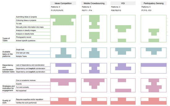 As shown in Table 4, there is a direct relationship between the types of tasks requested and the crowdsourcing technique applied. For example, in ideas competition, there is a higher incidence of tasks i, ii, and iii. In addition, participatory sensing platforms denote a higher incidence of tasks v and viii. Those platforms classified as VGI basically incorporate task iv, while mobile crowdsourcing applications present a more diverse spectrum of tasks.