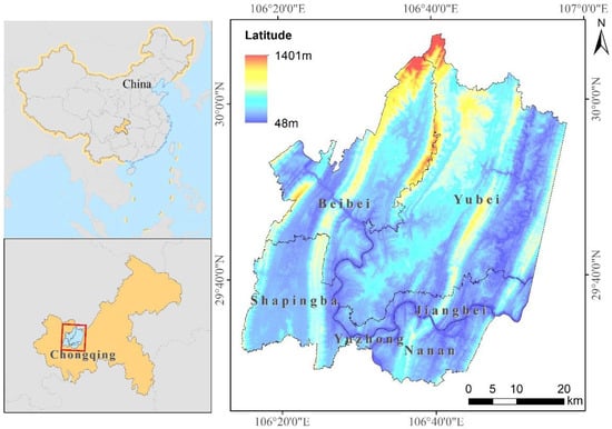 The study region lies from 106°14′17″ to 106°57′33″ E in longitude and from 29°27′39″ to 30°7′43″ N in latitude, with an area of 3028.24 km2 and an average elevation of 379.48 m. The study area lies at the intersection of Chongqing’s main city and the Landsat images with a rank number of 128039. This includes all of Yuzhong District, Shapingba District, Nan’an District, Beibei District and more than 90% of the Yubei and Jiangbei Districts (Figure 1).