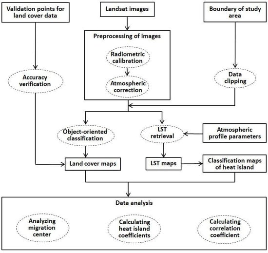 As shown in Figure 2, the Landsat images were preprocessed for land cover classification and LST retrieval. After that, LST data was divided into different heat island grades. Then the changes in land cover type, heat island effect, and the relationship between them were all analyzed for each district by calculating heat island coefficients and the migration of impervious surface and heat island centers.
