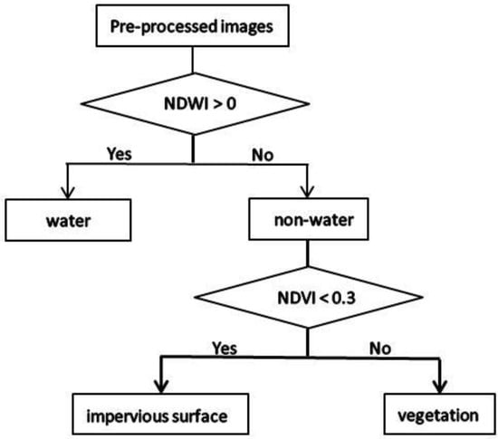 We performed radiometric calibration and atmospheric correction on the satellite images used in this study. Because impervious surface (urban buildings, traffic roads, etc.) [47], vegetation (farmland, grassland, garden land, etc.) and water (rivers, reservoirs, etc.) have great and distinct effects on the thermal environment in urban areas, the classification system was constructed with these three types only. First, we merged pixels of pre-processed images into objects via multiresolution segmentation and spectral difference segmentation. Then, using the object-oriented decision tree classification method, the land cover types in the study area were classified according to the normalized difference water index (NDWI) and the normalized difference vegetation index (NDVI), which were calculated with Formulas (1) and (2). As shown in Figure 3, when the NDWI value was greater than 0, it was considered water, otherwise it was non-water. Non-water objects having an NDVI value greater than 0.3 were considered vegetation. If the object did not fit into either of the first two categories, it was considered impervious surface. Subsequently, as is shown in Figure 4, 328 total verification points were selected from Google Earth using a stratified random sampling method. This included 67 points for 2001 and 2004, 66 points for 2009 and 2018, and 62 points for 2014. For each one, we manually assessed the proper land cover type classification to aid in the evaluation of the accuracy of the automated land cover classification. The producer accuracy (PA), user accuracy (UA), overall accuracy (OA) and kappa coefficient were calculated with Equations (3) to (6).