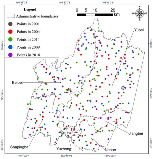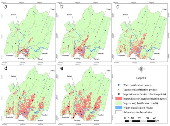 Distribution of land cover and verification points in 2001 (a), 2004 (b), 2009 (c), 2014 (d), and 2018 (e), respectively.