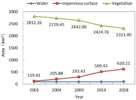We used verification points to evaluate the accuracy of land cover type classification. As demonstrated in Table 3, kappa coefficients were greater than 0.80 and overall accuracy was greater than 0.90 in 2001, 2004, 2009, 2014 and 2018. As shown in Figure 5, the proportional area of water cover was always the smallest, and its area did not change much from 2001 to 2018. In contrast, the impervious surface area gradually increased from 119.41 km2 in 2001 to 620.21 km2 in 2018, with the highest average annual growth rate occurring from 2009 to 2014 at 43.20 km2/year. Finally, the proportional area of vegetation was always the largest, but it decreased from year to year, mostly in accordance with the increase in impervious surface area. Figure 6 shows the spatial distribution of land cover types in 2001, 2004, 2009, 2014 and 2018.