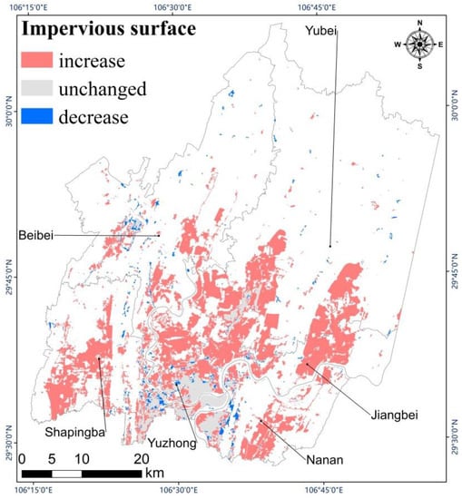 Impervious surface had a tendency to expand in both directions along a northeast axis. Although the impervious surface expanded rapidly toward the northeast, the northern part of Chongqing was still mainly covered by vegetation. Figure 7 shows the total spatial variation of impervious surface during the 17 years from 2001 to 2018. The unchanged areas are mainly distributed in and around Yuzhong District. Few areas decreased in impervious surface, and these were mainly distributed around the Yuzhong and the Beibei Districts. The four other districts tended to increase in impervious surface over the study period. By observing Google Earth Images, we found that most impervious surfaces in the study region contained buildings and that construction was the main reason why vegetation decreased and impervious surface increased.