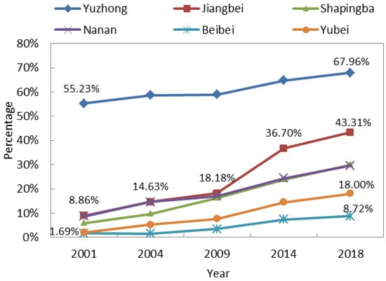 Because the expansion of impervious surface was tremendous and mainly caused by human activities in the study area, the change in proportional area of impervious surface from 2001 to 2018 was further analyzed. We calculated the variation in proportional area of impervious surfaces across the different districts (Figure 8). In order of greatest to lowest proportion of impervious surface, the six districts can be ranked as follows: Yuzhong District, Jiangbei District, Nanan District, Shapingba District, Yubei District and Beibei District. The impervious surface area proportion increased in all districts from 2001 to 2018, but the proportional and its temporal evolution varied greatly among the six districts. In the Yuzhong District, the proportional impervious surface area had been over 55% since 2001. By 2018 it had gradually increased to 67.69%. The proportional area of impervious surface was especially high in the Yuzhong District because it has been the political and commercial center in Chongqing for a while, at least since 2001. By sharp contrast, the proportional area of impervious surface was always lowest in the Beibei District, though it increased from 1.69% in 2001 to 8.72% in 2018. This low proportion is attributed to its great distance from Chongqing’s main city center, as well as its reputation as Chongqing’s “backyard”. Generally, the most conspicuous increase in proportional area of impervious surface occurred from 2009 to 2014 in all six districts, and the increase was especially remarkable in the Jiangbei District, where the proportion increased 18.52% more than the other districts. Governmental decisions vastly influenced this phenomenon. On June 18, 2010, the “Liangjiang New Area” was officially established as an important part of the government plan that contributed to rapid urban development in the Jiangbei District and beyond. From the above analysis, it is apparent that Chongqing’s main city experienced outstandingly rapid urban development from 2001 to 2018 and that the development differed notably among the districts. Thus it is crucial to study urban thermal environment based on each district in Chongqing’s main city.